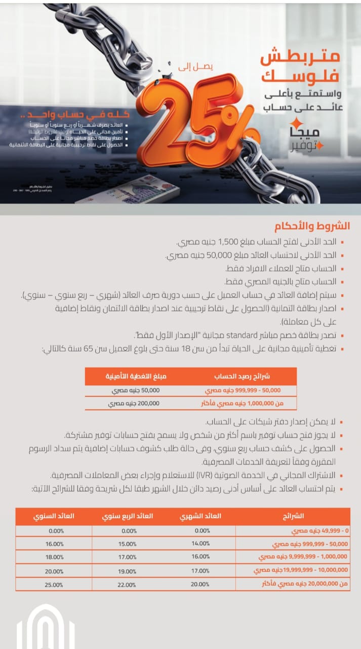 أعلن بنك القاهرة عن اطلاق حساب “ميجا التوفير” بعائد سنوي 25% ،و22% ربع سنوي وو20% عائد شهري.
