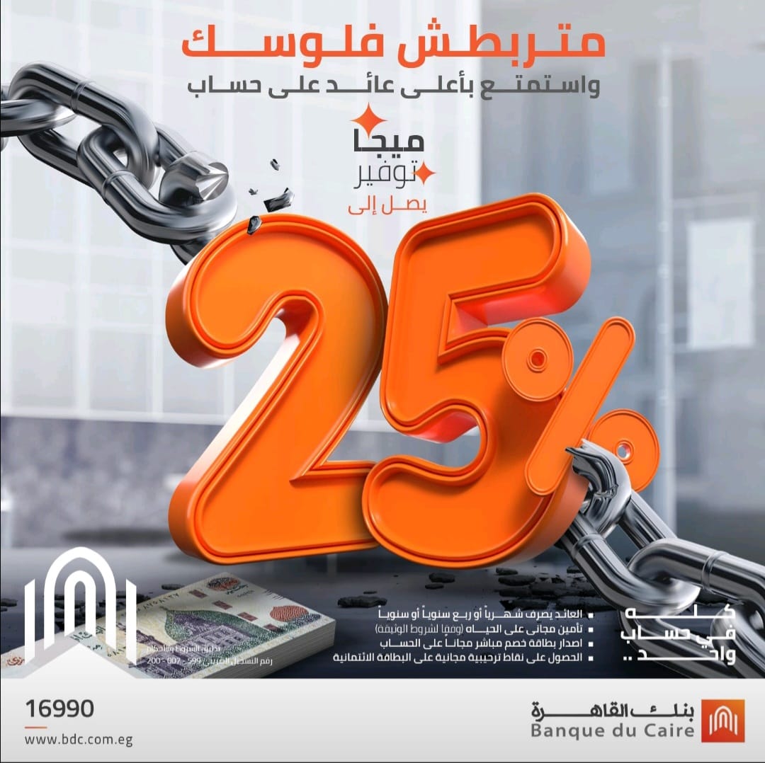 أعلن بنك القاهرة عن اطلاق حساب “ميجا التوفير” بعائد سنوي 25% ،و22% ربع سنوي وو20% عائد شهري.