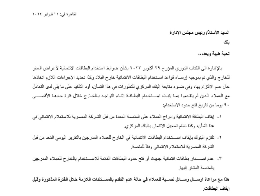 كما تتضمنت التعليمات إيقاف استخدام البطاقات الائتمانية في الخارج للعملاء المدرجين بالتقرير اليومي المعد من الشركة المصرية للاستعلام الائتماني وفقا للمنصة ، وعدم إصدار بطاقات ائتمانية جديدة لهم أو فتح حدود البطاقات القائمة للاستخدام بالخارج.
