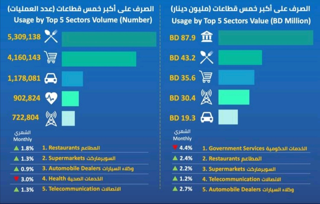 وفقا لأحدث لإحصاءات عمليات نقاط البيع وأنظمة المدفوعات في يناير 2024 الصادرة عن مصرف البحرين المركزي، فإن أكبر 5 قطاعات من حيث قيمة الصرف عليها كانت كالتالي