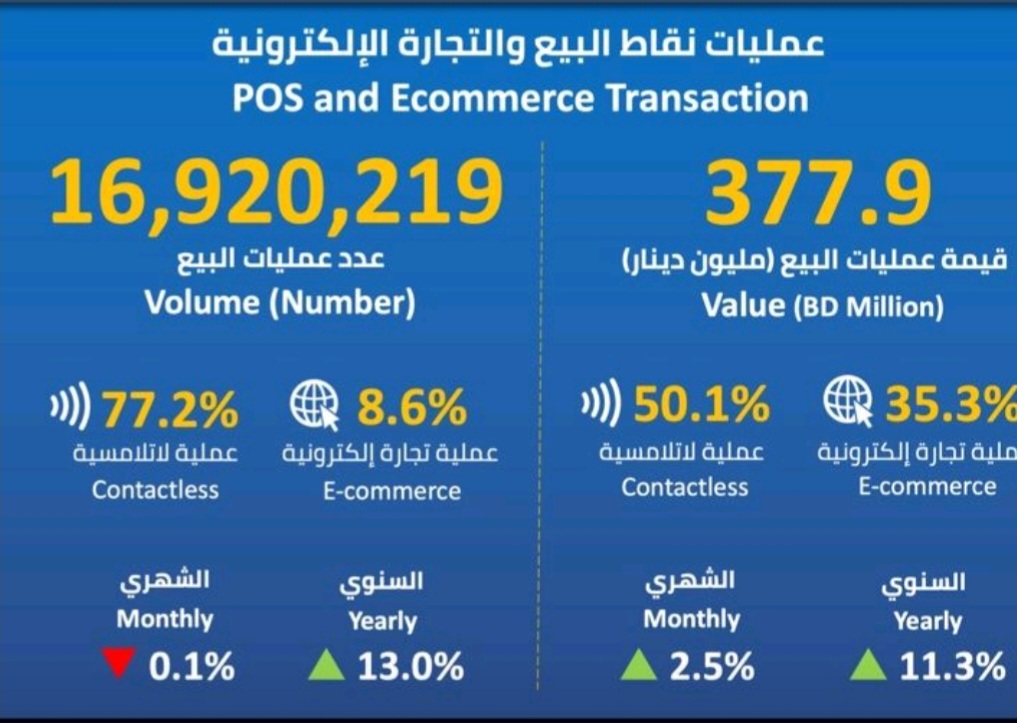 أعلن مصرف البحرين المركزي أن عدد عمليات البيع خلال شهر يناير الماضي، بلغت 16.920 مليون عملية، بتراجع شهري بلغ 0.1%و نمو سنوي 13%.