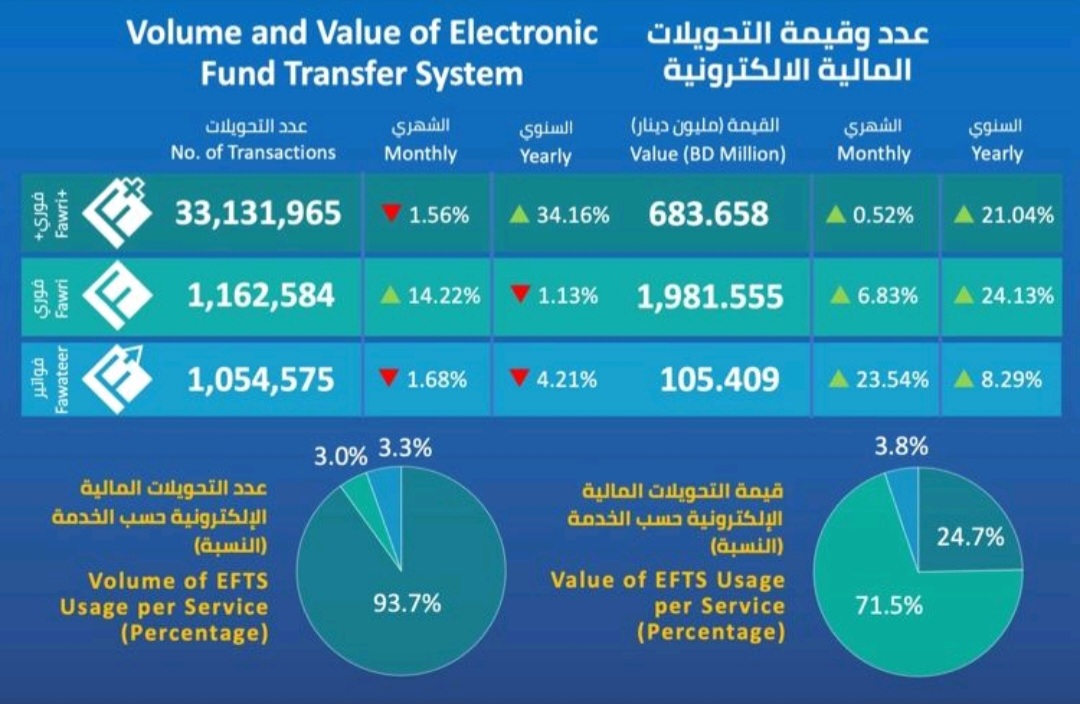 وعن عدد وقيمة التحويلات المالية الإلكترونية فقد ارتفعت تحويلات “فوري بلاس” بنسبة 21.04% إلى 683.658 مليون دينار عبر 33.131 مليون عملية، فيما زادت تحويلات “فوري” بنسبة 24.13% إلى 1.981 مليار دينار من خلال 1.162 مليون عملية تحويل، كما ارتفعت خدمة “فواتير” بنسبة 8.29% لتصل إلى 105.409 مليون دينار من خلال 1.054 مليون عملية.