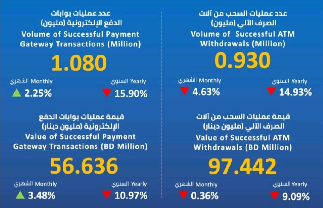 فيما بلغ عدد عمليات بوابات الدفع الإلكتروني 1.080 مليون عملية، بلغت قيمتها الإجمالية نحو 56.636 مليون دينار بتراجع سنوي بلغت نسبته 10.97%.