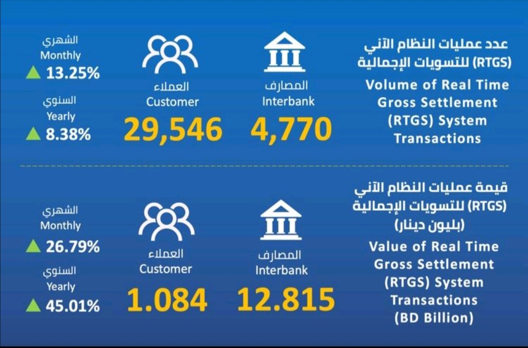 أما قيمة عمليات النظام الآني للتسويات الإجمالية لقطاع المصارف فبلغت 12.815 مليار دينار، ولقطاع الأفراد نحو 1.084 مليار دينار.