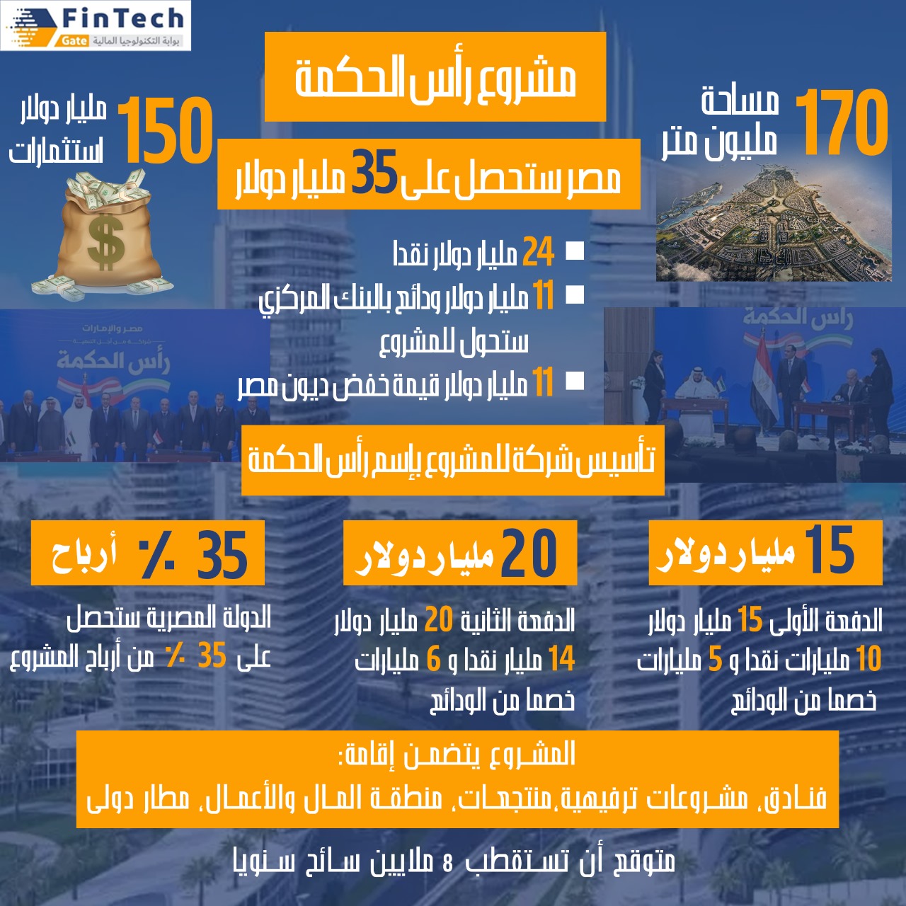 وأشار إلى أن المشروع يعتبر الأضخم من نوعه لأنه يستهدف تطوير مدينة مساحتها 170 مليون متر مربع، أي أكثر من 40 ألف و600 فدان، موضحًا أن شركة أبوظبي التنموية القابضة ستؤسس شركة قابضة أو شركة “أم” باسم شركة “رأس الحكمة” تكون المسؤولة عن المشروع وستكون بمساهمة مصرية.