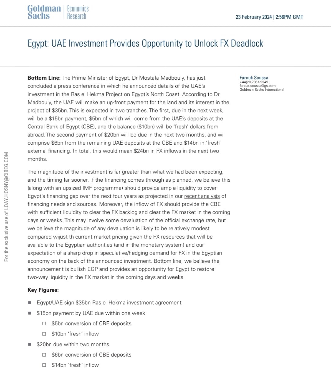 قالت مؤسسة جولدمان ساكس أن مشروع رأس الحكمة بالساحل الشمالي لمصر والذي أعلنت عنه الحكومة المصرية اليوم بقيمة 35 مليار دولار تدفعها دولة الإمارات ستسهم سيسهم في سد الفجوة التمويلية للبلاد كما سيسهم في القضاء على السوق السوداء.