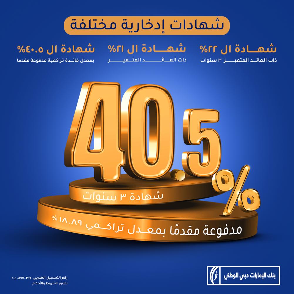 والجدير بالذكر أن بنك الإمارات دبي الوطني- مصر يحرص دائما على تلبية احتياجات عملائه المختلفة ولذلك طرح الشهادات الادخارية المختلفة للعملاء سواء الراغبين في الحصول على سعر عائد ثابت أو متغير.