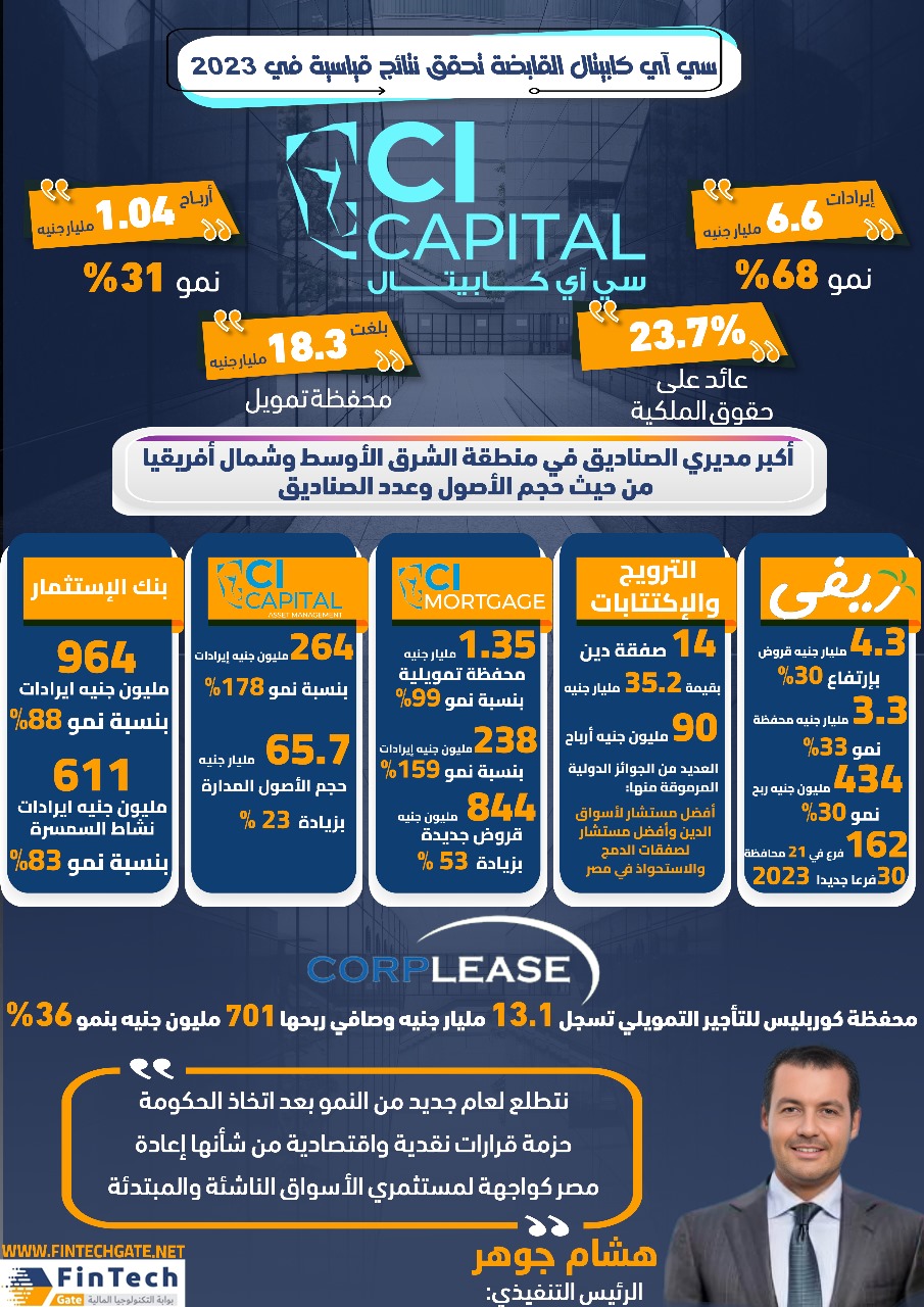 أعلنت شركة «سي آي كابيتال» القابضة للاستثمارات المالية (CICH.CA)، المجموعة الرائدة في الخدمات المالية المتنوعة، عن نتائج أعمالها المالية لعام 2023، محققة إجمالي إيرادات بلغت 6.6 مليار جنيه،بإرتفاع نسبته 68% مقارنة بالعام الماضي.