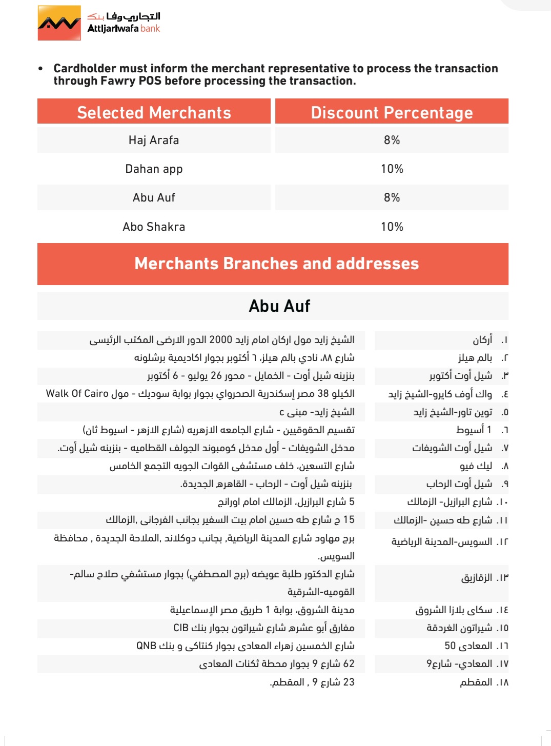 أعلن التجاري وفا بنك إيجيبت لعملائه خصومات تصل إلى 10% بدون حد أقصى عند استخدامهم بطاقات التجاري وفا بنك إيجيبت الائتمانية والخصم المباشر من خلال ماكينات فوري بمناسبة شهر رمضان.