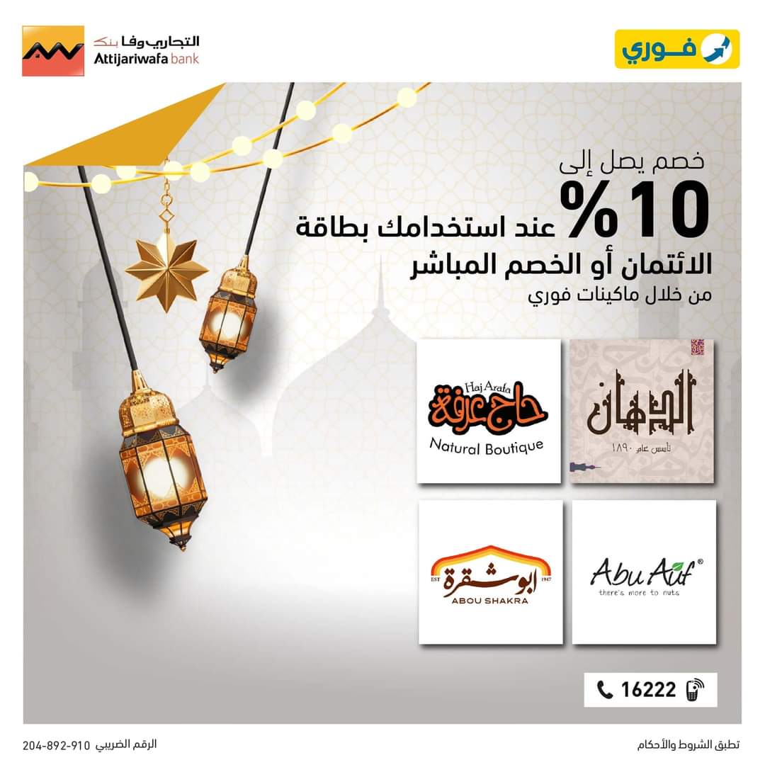 أعلن التجاري وفا بنك إيجيبت لعملائه خصومات تصل إلى 10% بدون حد أقصى عند استخدامهم بطاقات التجاري وفا بنك إيجيبت الائتمانية والخصم المباشر من خلال ماكينات فوري بمناسبة شهر رمضان.