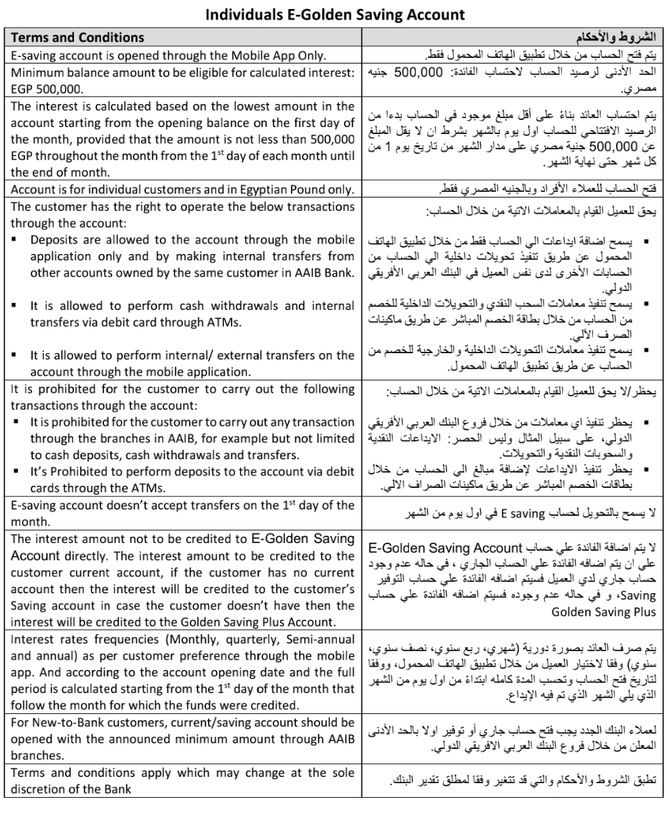 أعلن البنك العربي الأفريقي الدولي عن طرح حساب توفير جديد تحت إسم «E-Golden Saving» بعائد يصل إلى 30% وذلك اعتبارا من الأول من أبريل المقبل.