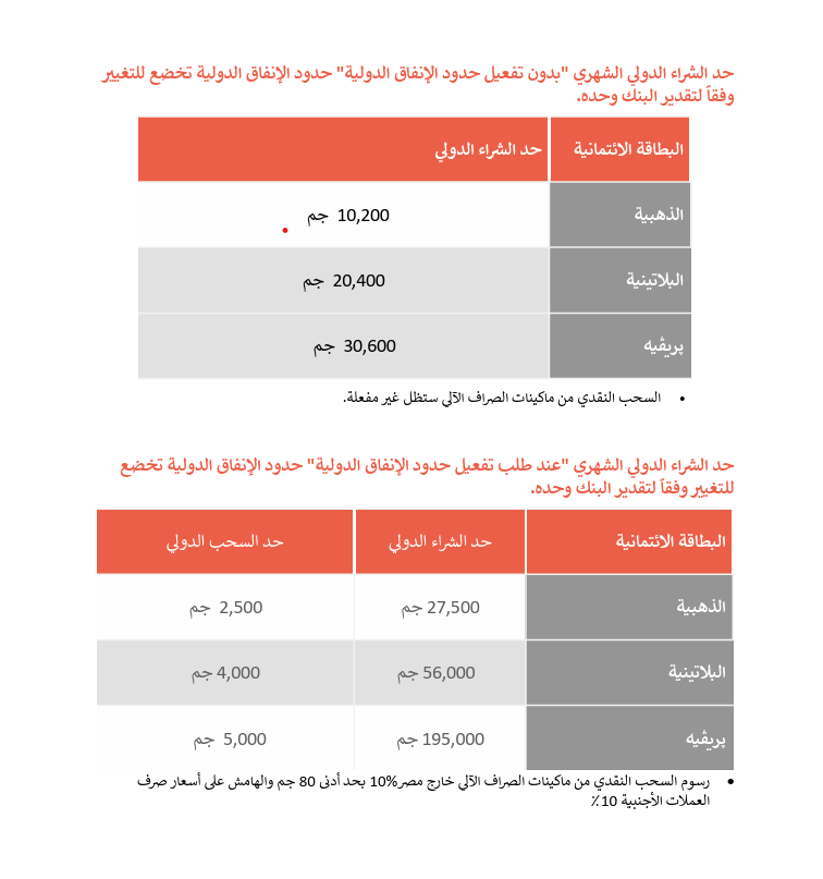 وعند طلب تفعيل حدود الإنفاق الدولية، أوضح البنك أن حد الشراء الشهري للبطاقة الذهبية يبلغ 27500 جنيه وحد السحب 2500 جنيه، والبلاتينية 56000 جنيه للشراء والسحب الدولي 4000 جنيه والبريفيه 195000 جنيه للشراء و5000 جنيه للسحب الدولي.