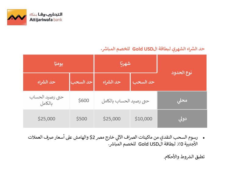 وبالنسبة لبطاقة جولد بالدولار للخصم المباشر، فيبلغ حد السحب اليومي 600 دولار وحد الشراء حتى الرصيد بالكامل، وشهريا حتى الرصيد بالكامل.