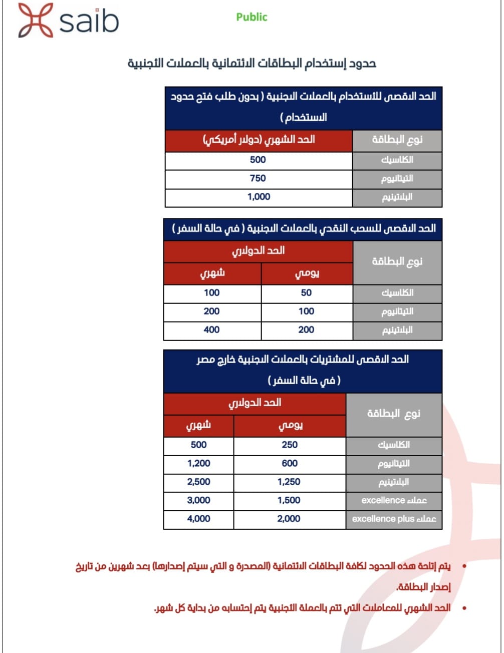 قرر بنك saib رفع حدود الاستخدام للبطاقات الإئتمانية بالعملة الأجنبية حتى 4000 دولار وذلك بعد أن حذت أكثر من 12 بنكا نفس الخطوة.
