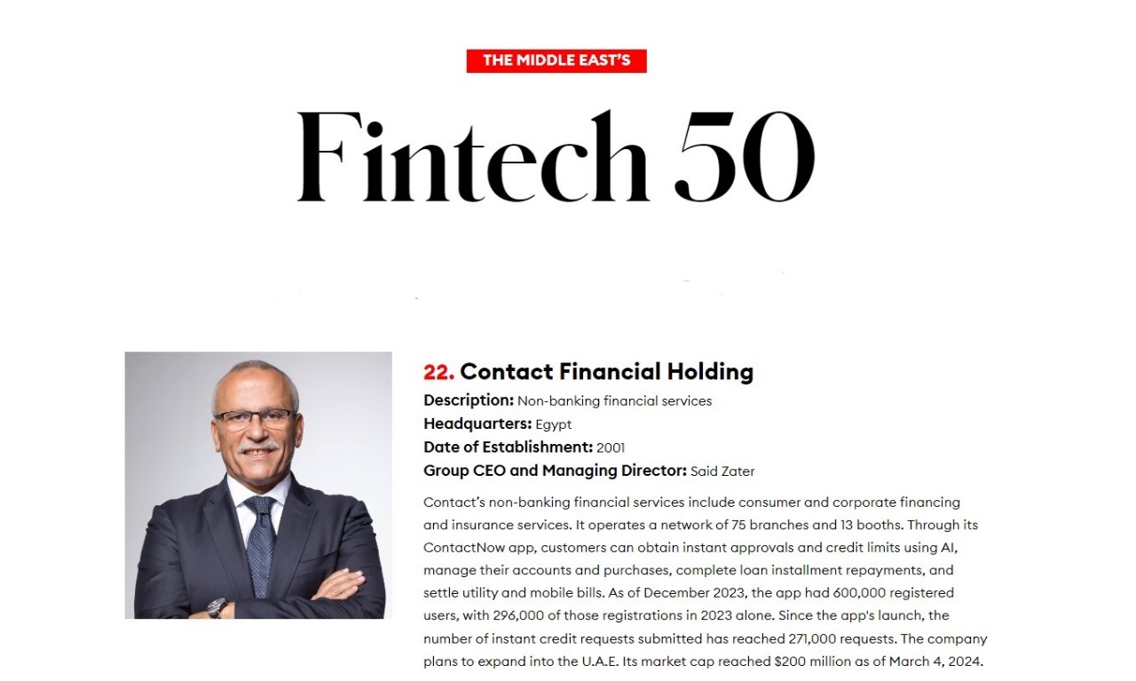 من جانبه قال سعيد زعتر الرئيس التنفيذي لشركة ” كونتكت المالية القابضة ” إن الابتكار هو قلب نجاحنا والتزامنا بالتميز هو روح شركتنا، مشيرا إلي أن تصنيفنا ضمن أفضل 50 شركة تكنولوجيا مالية في الشرق الأوسط لعام 2024′ ليس مجرد إنجاز، بل أنه دليل على ثقة عملائنا وتفاني فريقنا.