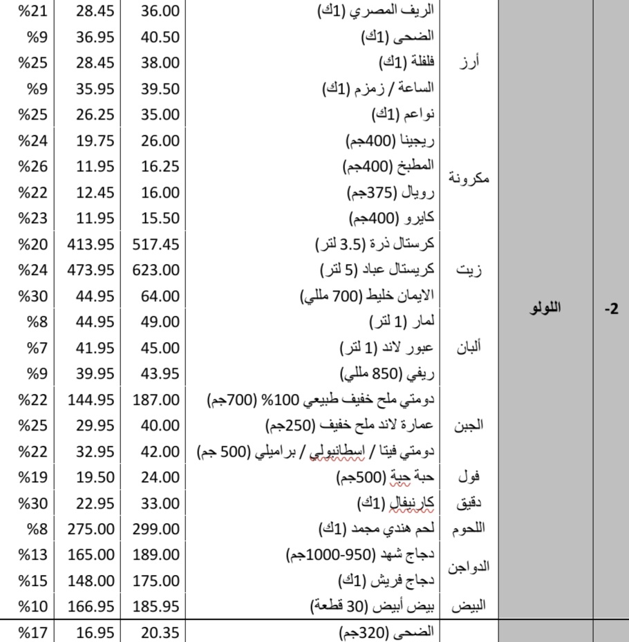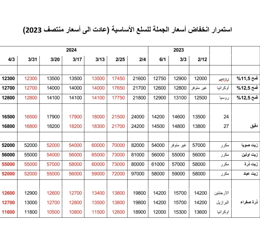 وأوضح في تصريحات له انخفاض أسعار الجملة لكافة السلع الأساسية والذي تجاوز 25% في العديد من السلع، لافتا إلى أن أسعار “القمح” انخفضت من ما يتراوح بين 21800 و21600 جنيه للطن في 4 فبراير الماضي إلى مستويات 12300 و12800 جنيه للطن في 4 مارس الماضي، كما تراجعت أسعار “الدقيق” من مستويات 24000 و24200 جنيه للطن إلى مستويات 16500 و16800 جنيه للطن.