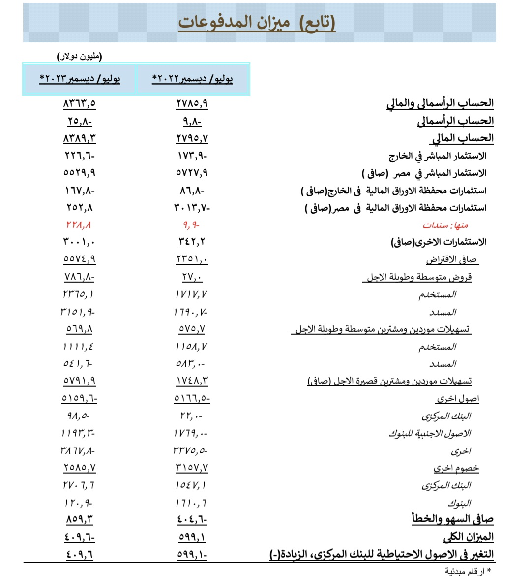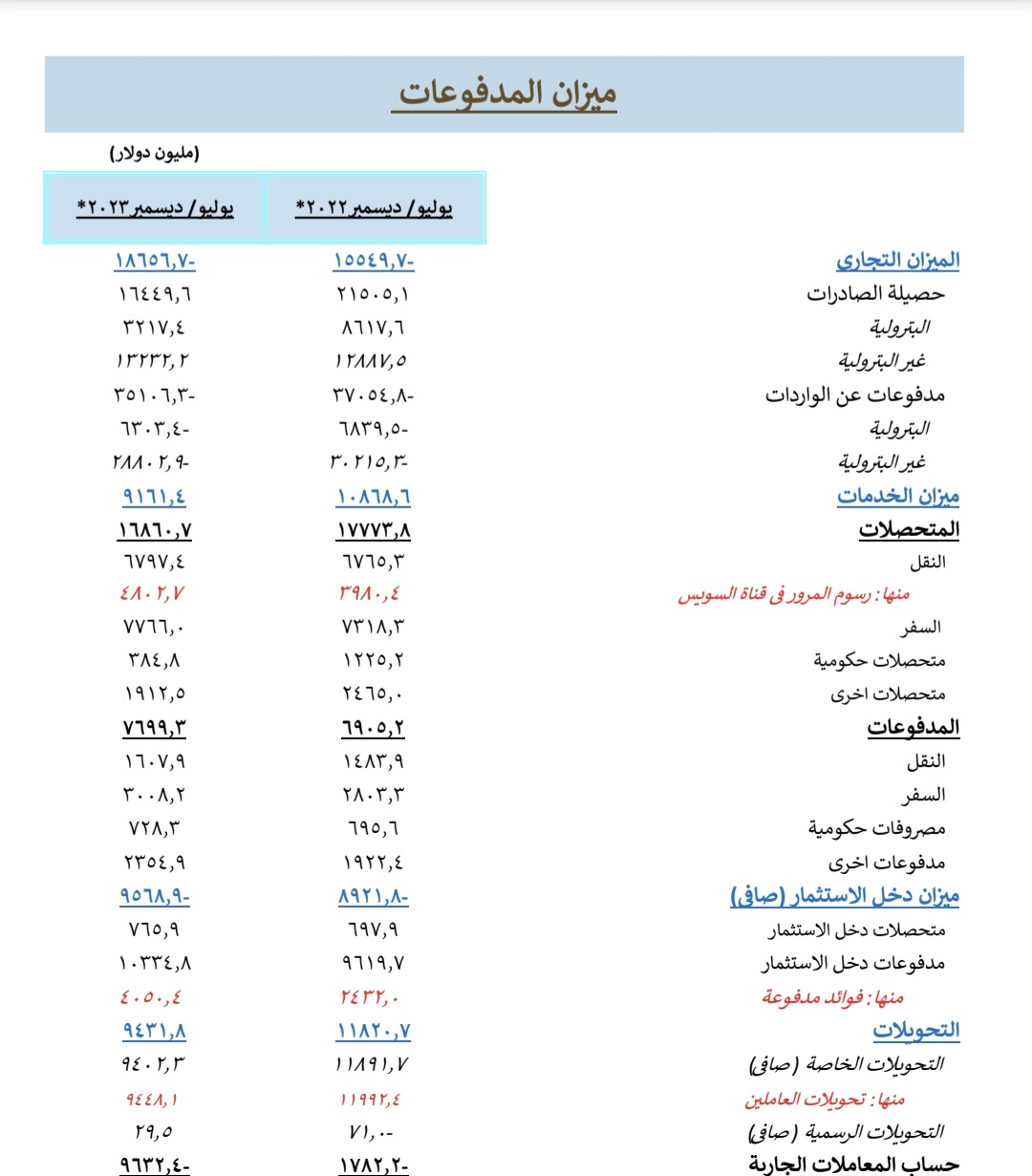 أسفرت معاملات الاقتصاد المصري مع العالم الخارجي خلال النصف الأول من السنة المالية 2024/2023 الفترة(يوليو/ديسمبر 2023) عن عجز كلي في ميزان المدفوعات قدره 409.6 مليون دولار مقابل فائض كلي قدره 599.1 مليون دولار خلال نفس الفترة من السنة المالية السابقة).