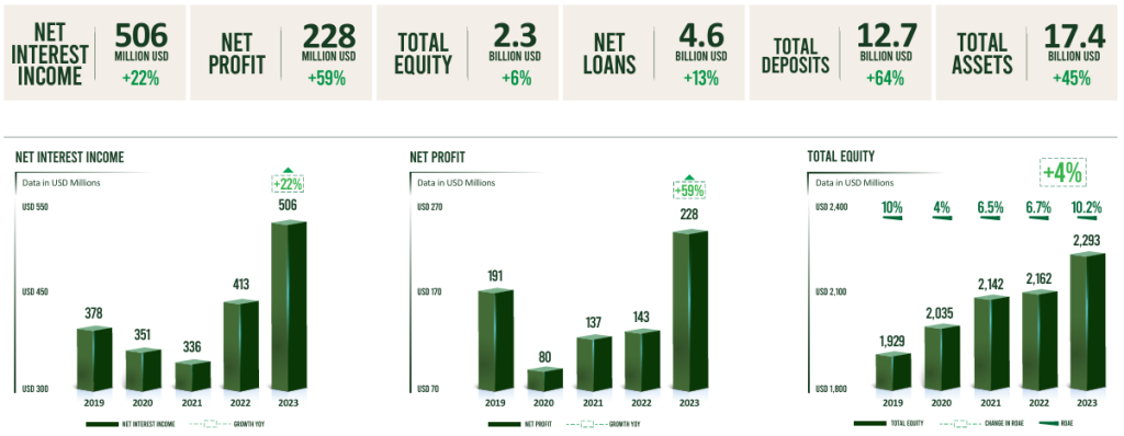 On the same front, Net Banking Income grew by 17% nominally to reach USD 593 million, a peer-to-peer growth of 83%. As a result, AAIB’s net profit reached USD 228 million by YE 2023, compared to USD 143 million in 2022, marking a nominal growth of 59%, and a peer – to – peer growth of 148% YoY, despite running elevated provisioning levels amid economic uncertainty and geopolitical challenges. The solid earnings translated into a double digit ROAE of 10.2% stretching by 400bps over our performance last year.