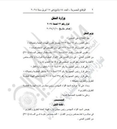نشرت جريدة الوقائع الرسمية، في عددها رقم 84 الصادر في 15 أبريل لسنة 2024، قرار وزير النقل رقم 22، والمختص بتفويض رئيس مجلس إدارة الهيئة العامة للطرق والكباري بمباشرة اختصاصات وزير النقل.