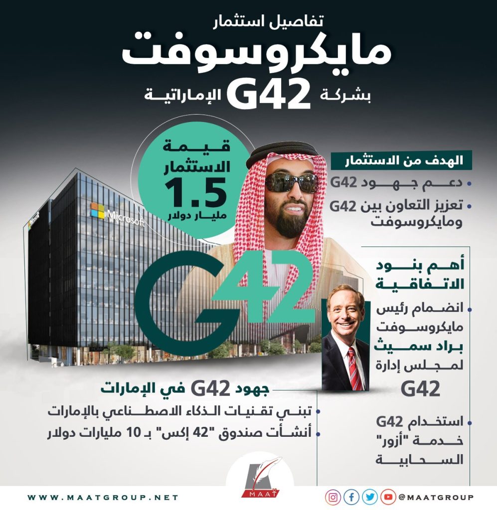 ووفقا لإنفوجراف نشرته مؤسسة “ماعت جروب” تنص الاتفاقية، من بين بنودها، على انضمام رئيس “مايكروسوفت” براد سميث إلى مجلس إدارة “جي 42″، واستخدام الأخيرة خدمة “أزور” السحابية التابعة لصانعة البرمجيات الأميركية في تطبيقات الذكاء الاصطناعي. كما تحظى هذه الشراكة التجارية بدعم كامل من الحكومتين الإماراتية والأميركية من خلال اتفاقية غير مسبوقة تضمن تطبيق أفضل الممارسات العالمية لضمان تطوير ونشر الذكاء الاصطناعي بشكل آمن وموثوق ومسؤول، وفق وكالة الأنباء الإماراتية (وام).