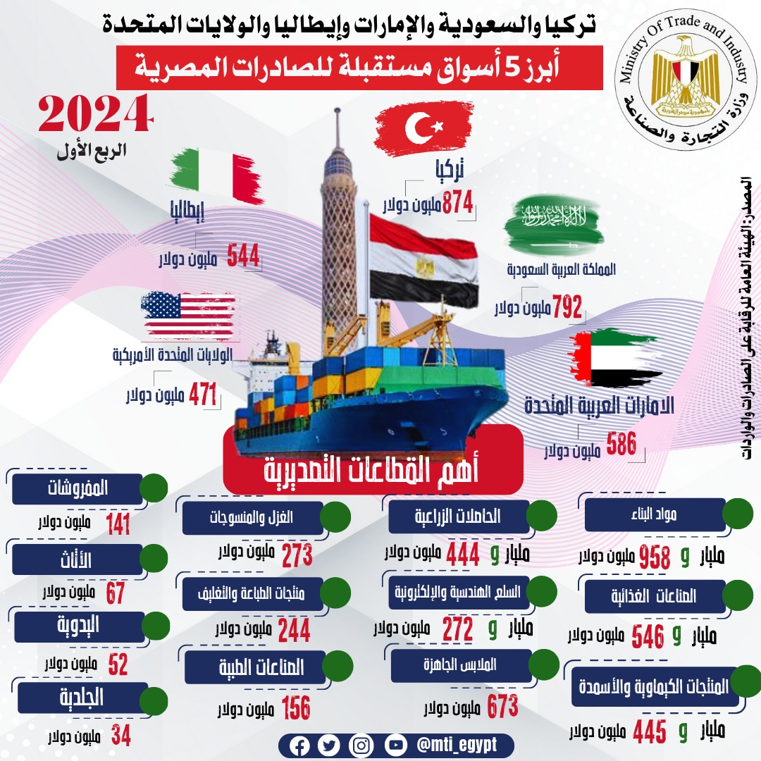 جاء ذلك في سياق أحدث تقرير تلقاه الوزير من الهيئة العامة للرقابة على الصادرات والواردات حول مؤشرات الصادرات السلعية المصرية خلال الربع الأول من عام 2024.