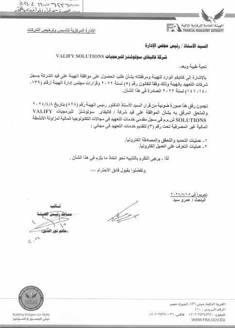 حصلت شركة «فاليفاي سولوشنز لحلول البرمجيات VALIFY SOLUTIONS» على رخصة مقدم خدمات التعهيد في مجالات التكنولوجيا المالية من الهيئة العامة للرقابة المالية في مصر.