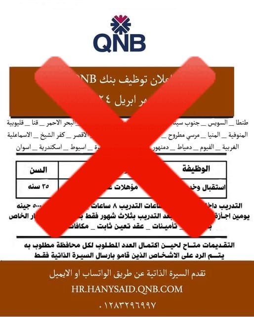 ويُنبه QNB الأهلي عملاءه إلى أن هناك جهات غير مسؤولة تُنشر إعلانات توظيف وهمية باسم البنك على مواقع إلكترونية أخرى، بهدف خداع الباحثين عن عمل.