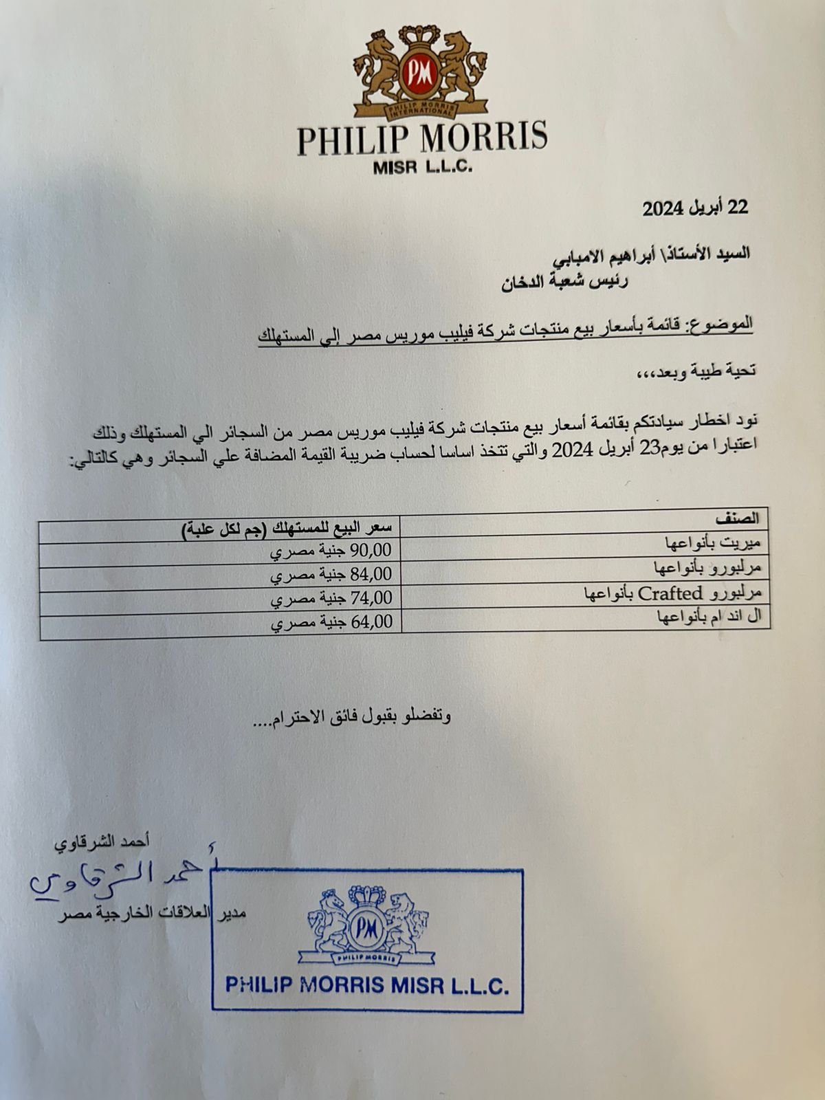 أعلنت شركة فيليب موريس مصر عن الأسعار الجديدة لمنتجاتها من السجائر والتي تطبقها اعتبارا من غدا الثلاثاء الموافق 23 أبريل 2024.