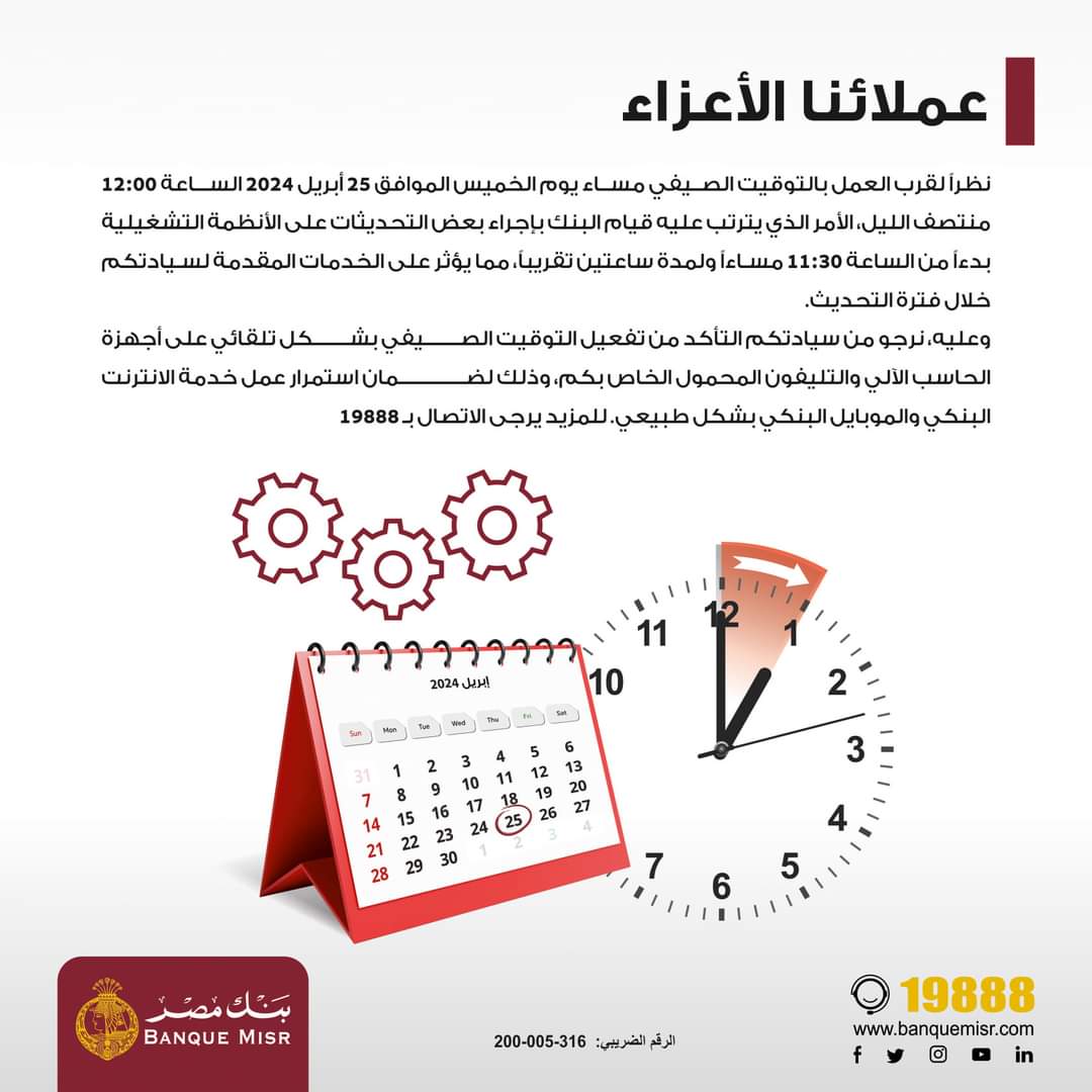 وطالب البنك من عملائه التأكد من تفعيل التوقيت الصيفي بشكل تلقائي على أجهزة الحاسب الآلي والتليفون المحمول الخاص بهم، وذلك لضمان استمرار عمل الخدمات الإلكترونية بشكل طبيعي.