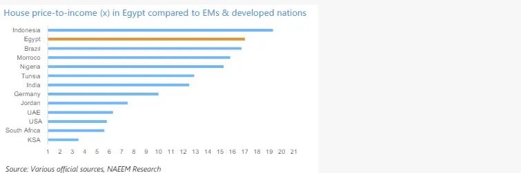 قالت بحوث شركة “نعيم القابضة”، إن القدرة على تحمل تكاليف السكن في مصر منخفضة مقارنة بالدول الناشئة والمتقدمة الأخرى. إذ تبلغ نسبة قيمة المنزل إلى متوسط الدخل السنوي في مصر 17 ضعفاً، وقد تدهورت هذه النسبة على مدى السنوات العشر الماضية بسبب الانخفاض الحاد في قيمة العملة المحلية نتيجة لبرامج الإصلاح الاقتصادي المتفق عليها مع صندوق النقد الدولي منذ عام 2016، والتي تفاقمت بسبب تدفقات رأس المال الأجنبي إلى الخارج الناجمة عن التوترات الجيوسياسية منذ عام 2022.