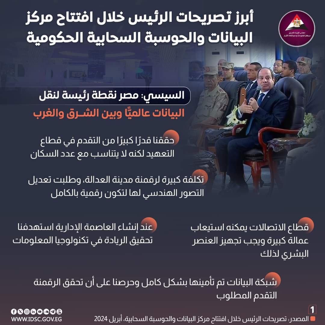 سلط مركز المعلومات ودعم اتخاذ القرار بمجلس الوزراء، الضوء على تصريحات الرئيس عبدالفتاح السيسي، خلال افتتاح مركز البيانات والحوسبة السحابية الحكومية، إذ أدلى الرئيس بعدة تصريحات مهمة، تتعلق بهذا المركز، وجهود مصر للدخول في قطاع الاتصالات والرقمنة وتكنولوجيا المعلومات، والفرص المتاحة لها في هذا المجال.
