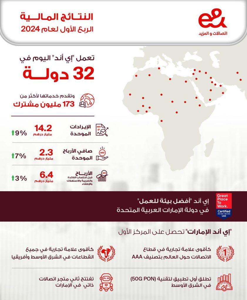 وعلى مستوى قاعدة المشتركين، سجلت “إي آند الإمارات” نموا ملحوظا في الربع الأول من العام 2024، حيث وصل عدد مشتركيها إلى 14.5 مليون مشترك، في حين وصل إجمالي عدد مشتركي المجموعة إلى 173 مليون في 32 دولة بزيادة قدرها 5 % بالمقارنة مع الفترة نفسها من العام الماضي.