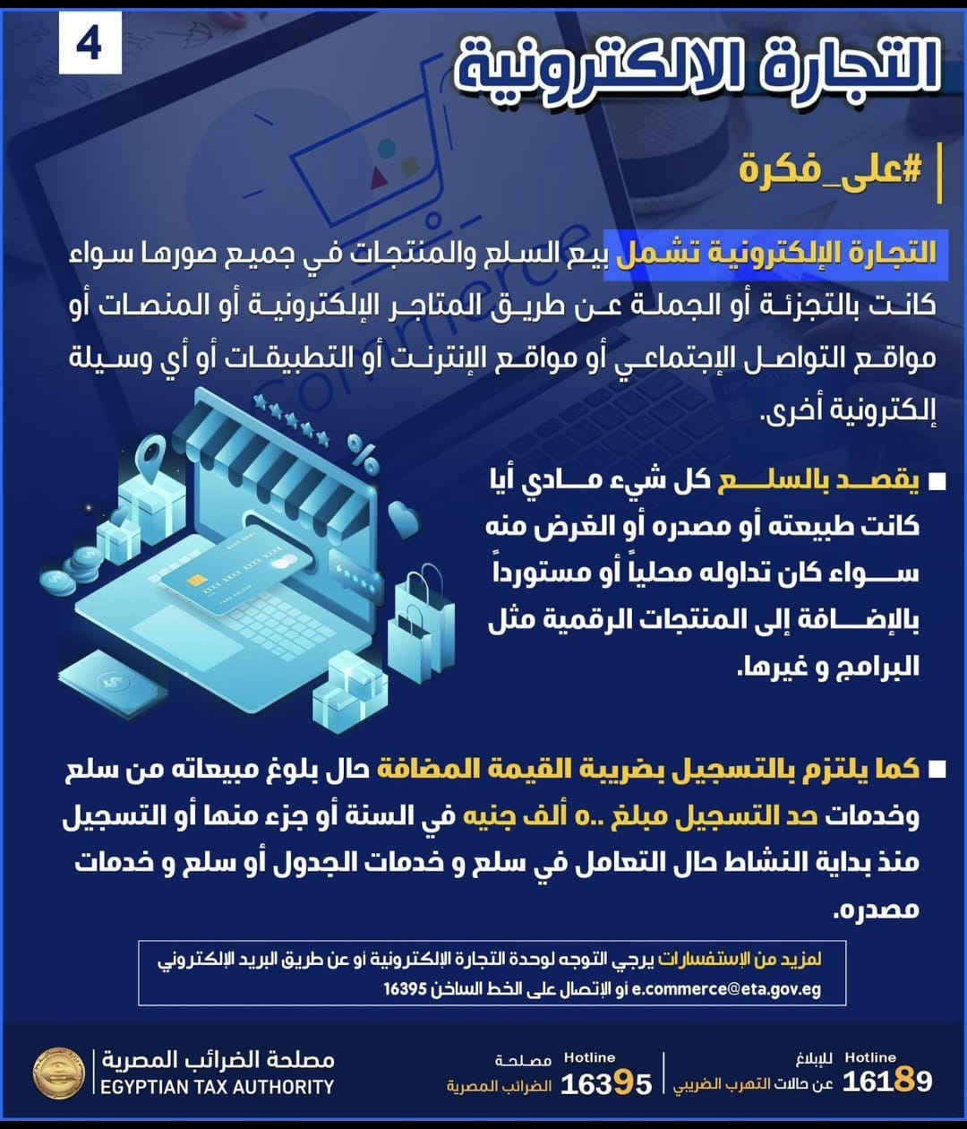 وحرصت وحدة التجارة الإلكترونية بمصلحة الضرائب المصرية من خلال صفحاتها على مواقع التواصل الإجتماعي المختلفة، في تقديم الشرح المفصل لهذه المفاهيم مع إرفاقها برسومات – إنفوجرافات توضحية مبسطة حتى تسهل على المواطنين وأصحاب الأعمال استيعابها بما يساعدهم على انجاز أعمالهم.