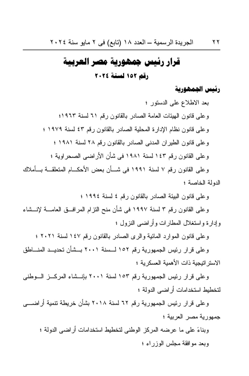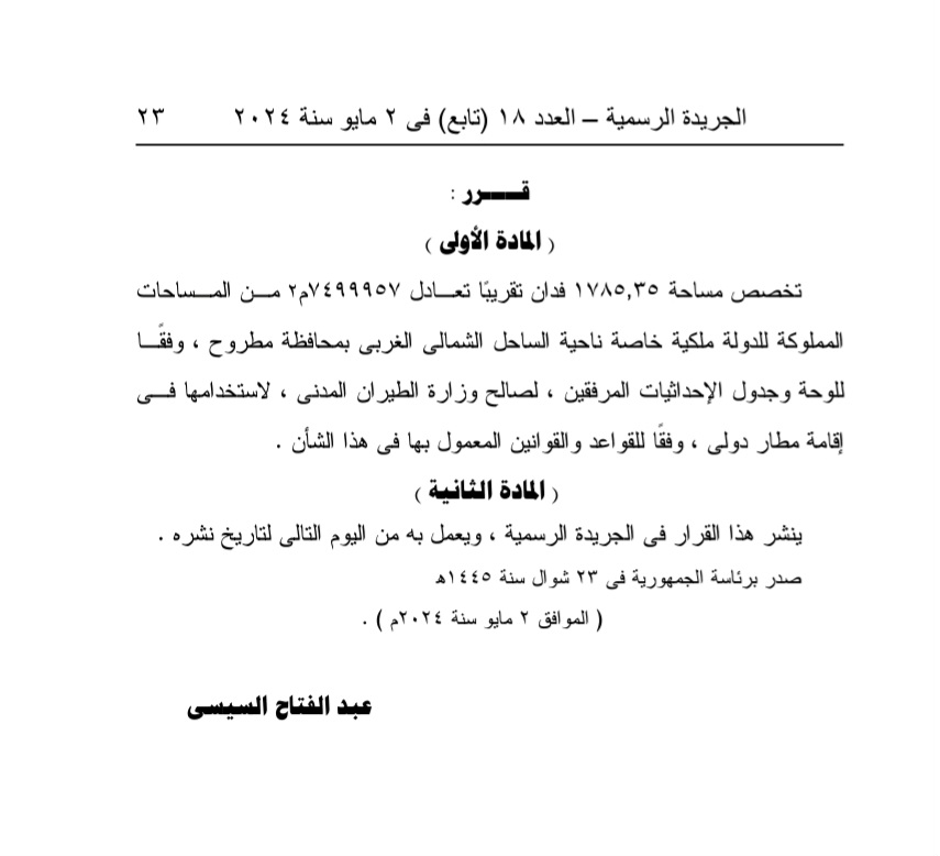 نشرت الجريدة الرسمية، قرار للرئيس عبدالفتاح السيسي رقم 152 لسنة 2024 والذي نص على تخصص مساحة 1785،35 فدان تقريبا تعـادل 7499957 م2 مـن المـساحات المملوكة للدولة ملكية خاصة ناحية الساحل الشمالى الغربى بمحافظة مطروح، وفقًـا للوحة وجدول الإحداثيات المرفقين، لصالح وزارة الطيران المدنى، لاستخدامها فـى إقامة مطار دولي، وفقًا للقواعد والقوانين المعمول بها في هذا الشأن.