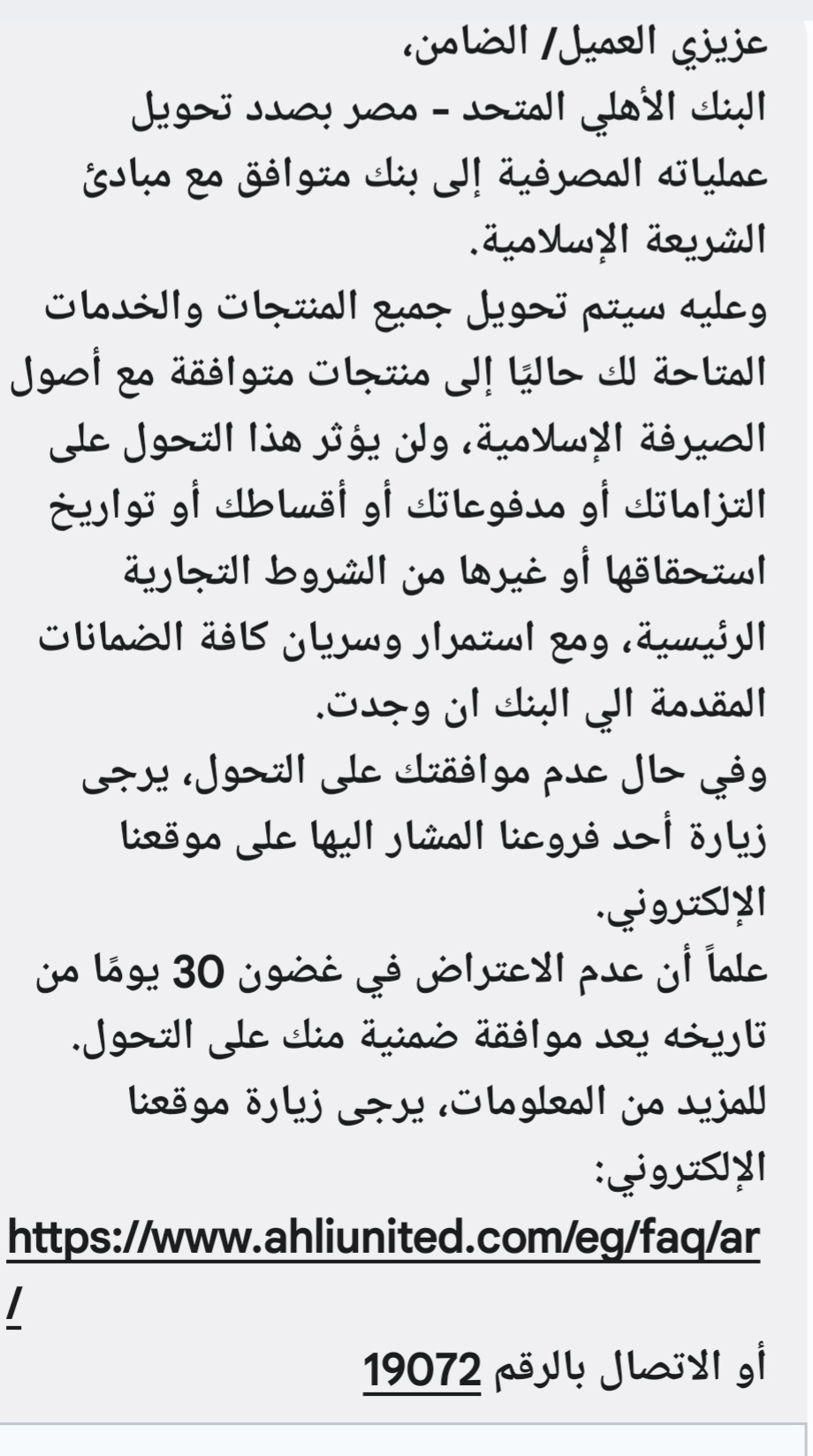 وأوضح في رساله بعث بها إلى عملائه أنه سيتم تحويل جميع المنتجات والخدمات المتاحة لك حاليًا إلى منتجات متوافقة مع أصول الصيرفة الإسلامية.