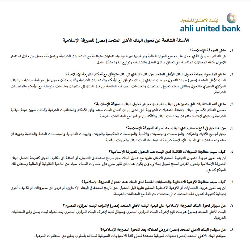وفيما يلى الأسئلة الشائعة عن تحول البنك الأهلي المتحد (مصر) للصيرفة الإسلامية
