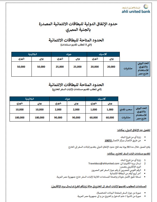 الحدود المتاحة للبطاقات الائتمانية التى تتطلب تقديم مستندات لإثبات السفر للخارج: