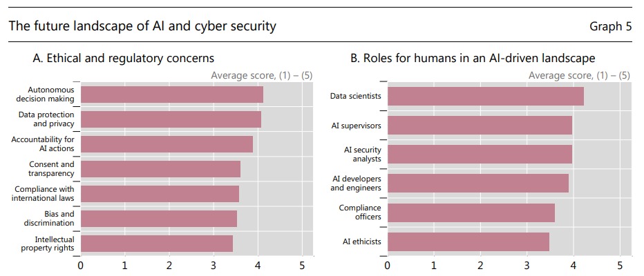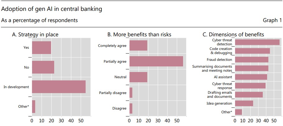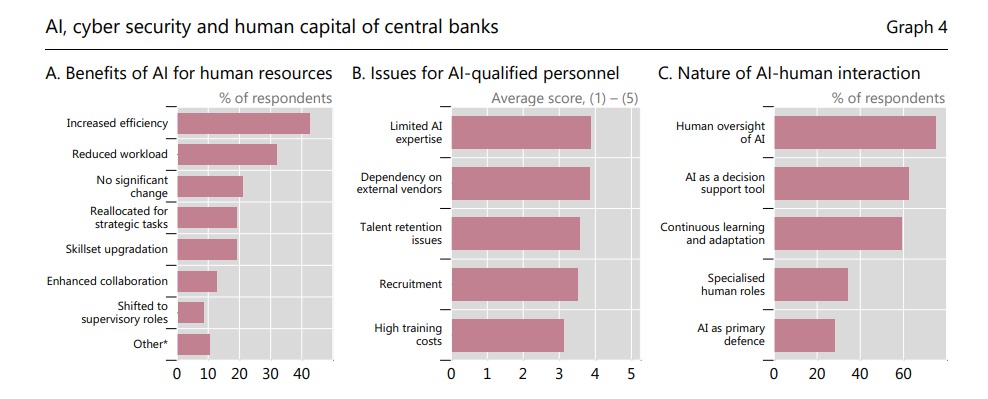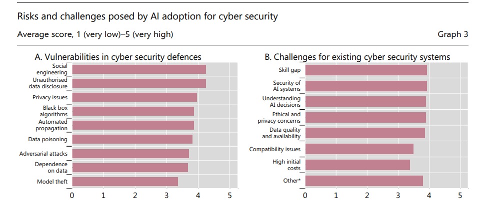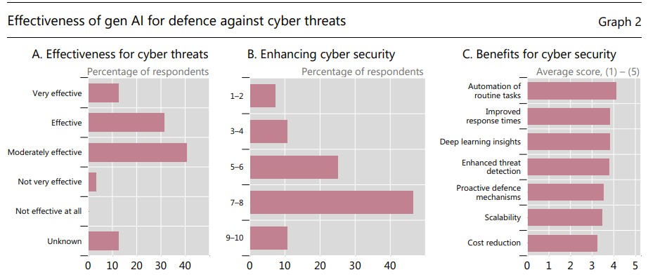 كشف تقرير صادر عن البنك بعد استطلاع آراء 32 من البنوك المركزية الأعضاء، أن ثلثي هذه البنوك (أي ما يقارب 71%) تستخدم بالفعل تقنيات الذكاء الاصطناعي الإبداعي لمواجهة التهديدات الإلكترونية، بينما تخطط 26% أخرى لتبني هذه التقنيات خلال العامين المقبلين.