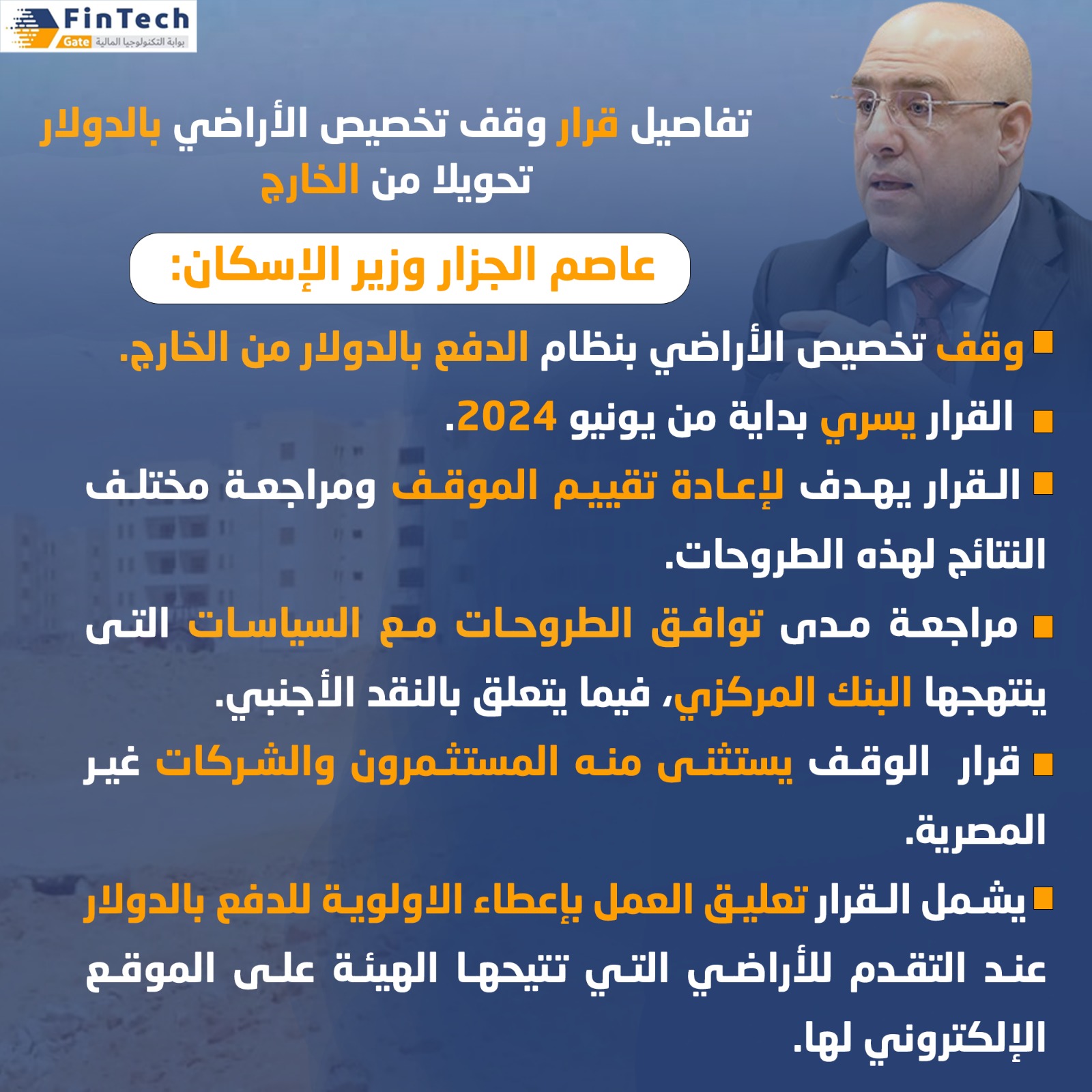 وصرح الدكتور عاصم الجزار، وزير الإسكان والمرافق والمجتمعات العمرانية، بأن هيئة المجتمعات العمرانية الجديدة ستوقف نظام التخصيص بالدولار من الخارج بداية من هذا الشهر يونيو 2024، لحين تقييم الموقف ومراجعة مختلف النتائج لهذه الطروحات ومدى توافقها مع السياسات التى ينتهجها البنك المركزي، فيما يتعلق بالنقد الأجنبي، ويستثنى من ذلك المستثمرون والشركات غير المصرية.
