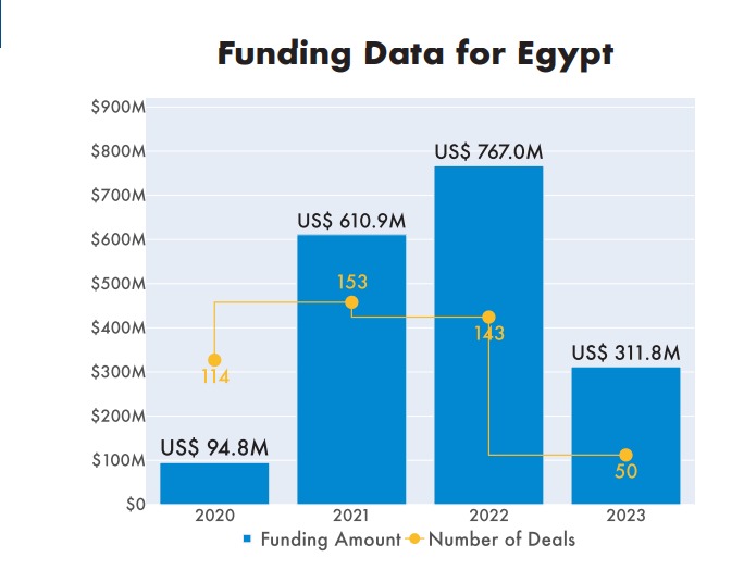 ووفقًا للتقرير ارتفعت تمويلات الشركات الناشئة فى مصر إلى 311.8 مليون دولار فى عام 2023 عبر 50 صفقة مقابل 94.8 مليون دولار فى 2020 من خلال 114 صفقة، بينما سجلت أعلى معدل لها فى عام 2022 بقيمة 767 مليون دولار عبر 143 صفقة.