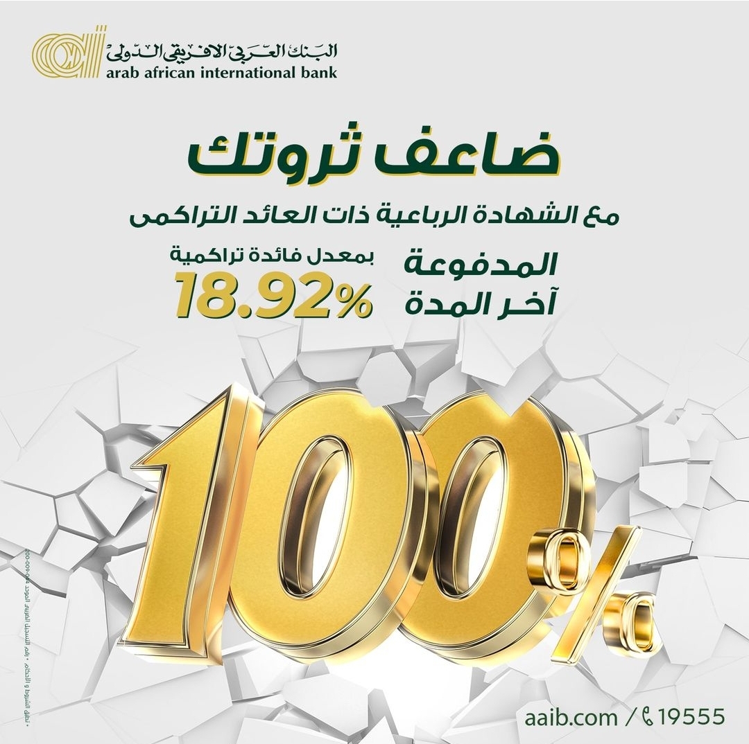 أطلق البنك العربي الأفريقي الدولي الشهادة “الرباعية” الجديدة ذات العائد التراكمي المدفوع آخر المدة.