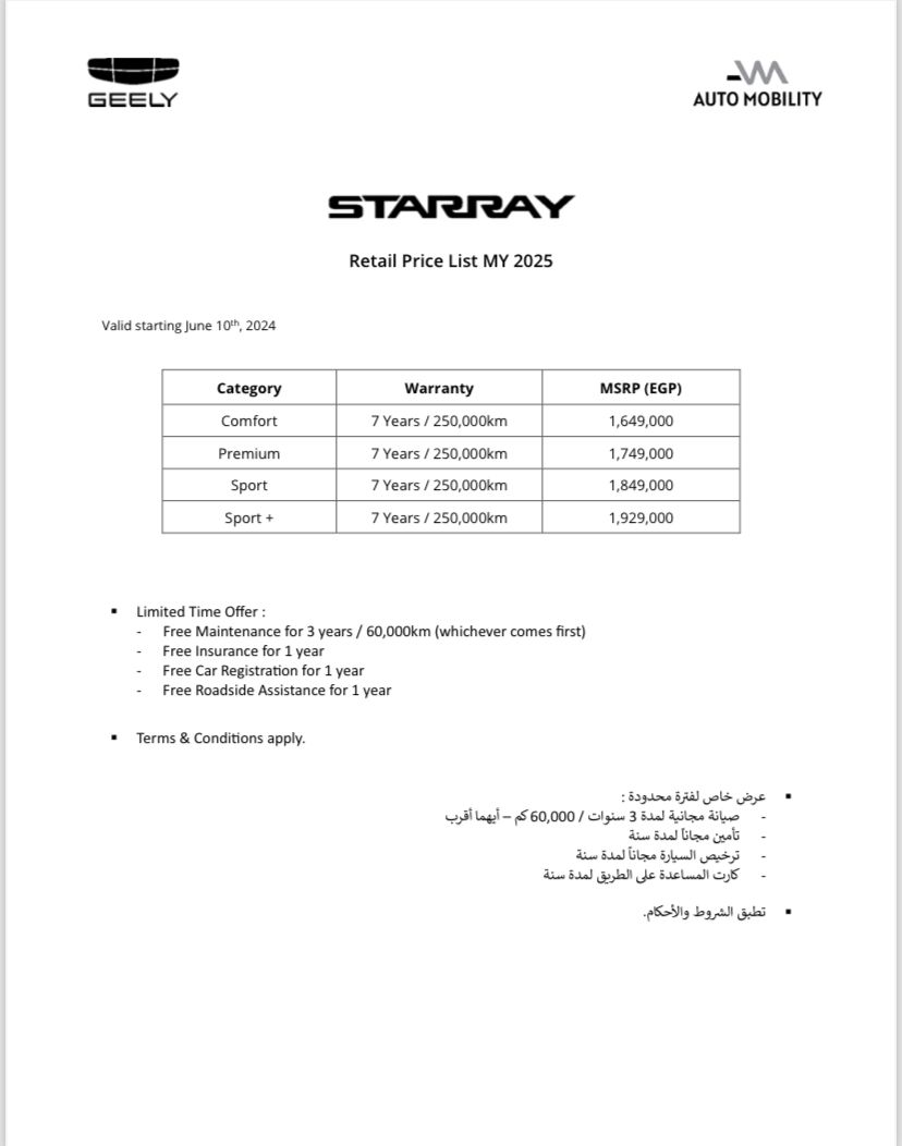 وفي هذا السياق، صرّح عثمان عبد المنعم، العضو المنتدب لشركة أوتو موبيليتي: “سعداء بالإعلان عن جيلي ستارراي الجديدة ٢٠٢٥ بفئاتها الأربعة ذات المزايا غير المحدودة فهي الخيار الأنسب لكل محبي الجودة والرفاهية.
