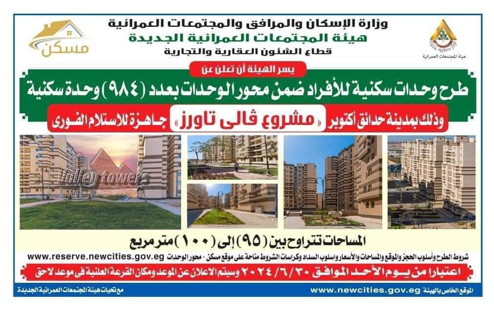 أعلنت وزارة الإسكان والمرافق والمجتمعات العمرانية الجديدة عن طرح 984 وحدة سكنية بالمرحلة الأولى من بمشروع “Valley towers” بمدينة حدائق أكتوبر.