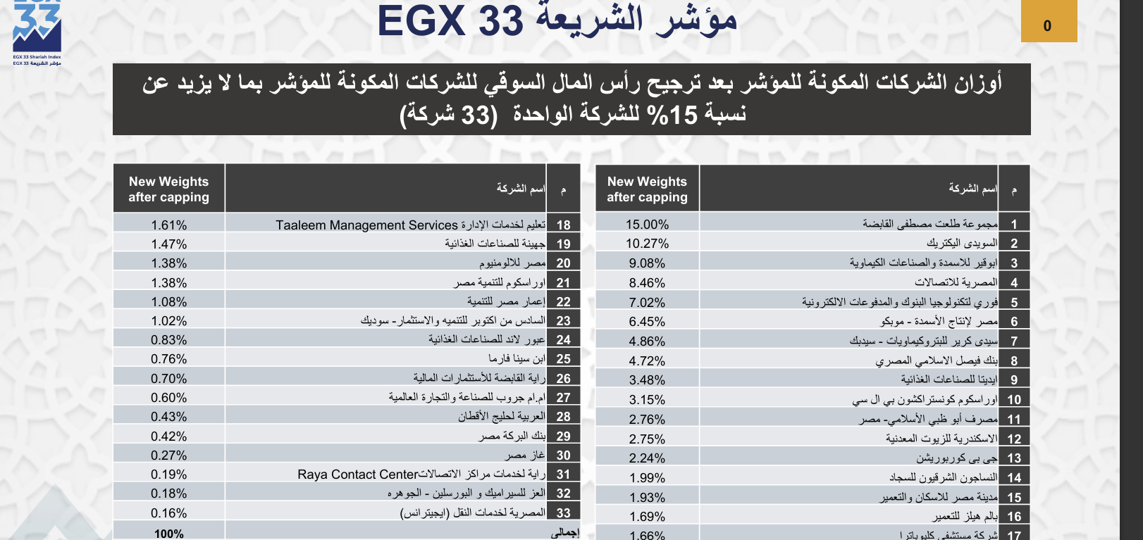 أطلقت البورصة المصرية اليوم مؤشر الشريعة EGX33 Shariah Index الذي يضم 33 شركة تتفق أنشطتها مع أحكام ومبادئ الشريعة الإسلامية.