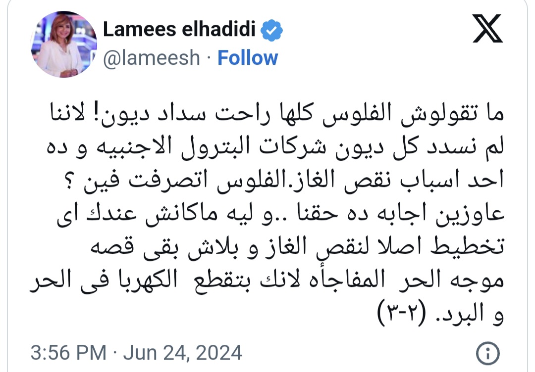 وكتبت عبر صفحتها الرسمية بمنصة «إكس»، اليوم الاثنين: «إلى رئيس الوزراء المشغول بتشكيل الحكومة، في فلوس أهو لاستيراد الغاز غير فلوس رأس الحكمة، صندوق النقد، استثمارات الأجانب في أدوات الدين 30 مليار دولار.. ليه مش بنستورد غاز للكهربا بدل بهدلتنا».