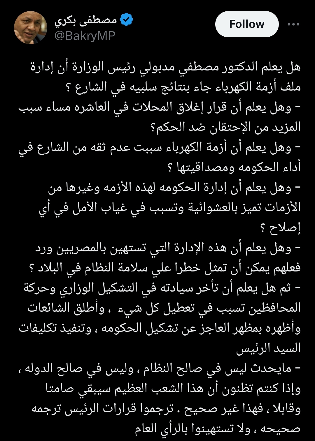 – هل يعلم الدكتور مصطفي مدبولي رئيس الوزارة أن إدارة ملف أزمة الكهرباء جاء بنتائج سلبيه في الشارع ؟