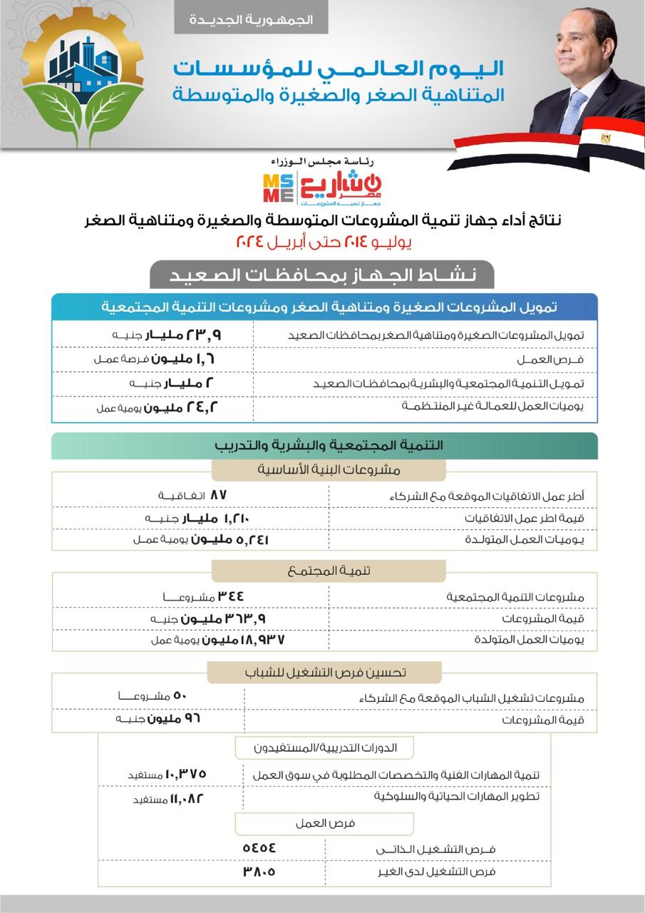 وقال رئيس جهاز تنمية المشروعات أن الجهاز نجح في ضخ إجمالي تمويلات بلغت 3.2 مليار جنيه مولت 119.9 ألف مشروع صغير ومتناهي لقرى حياه كريمة وفرت 207.5 ألف فرصة عمل، وبلغت نسبة التمويل الموجه لمحافظات وجه قبلي %78.