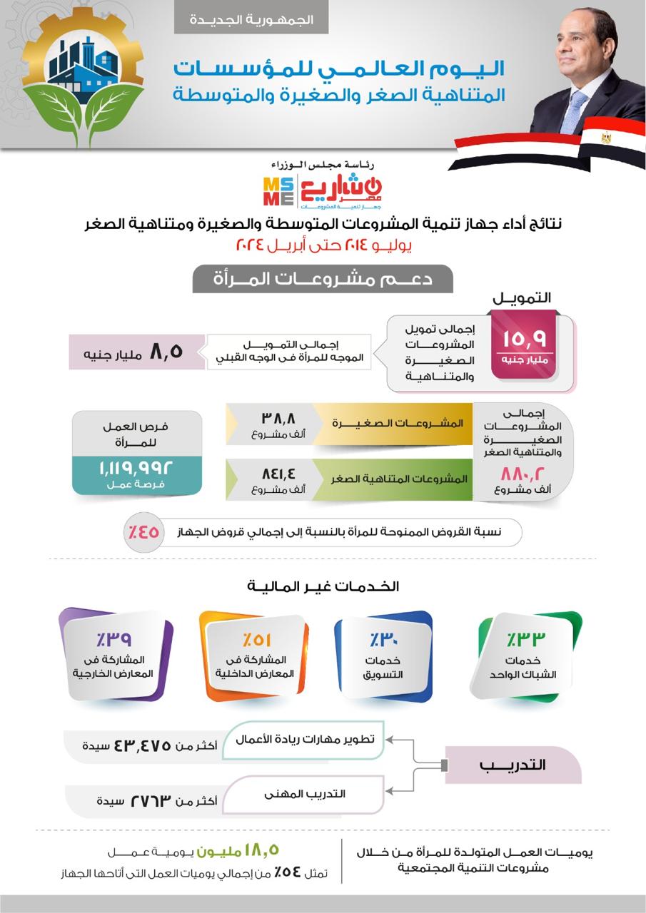 وأشار رحمي إلى قيام الجهاز بضخ تمويلات للمشروعات الصغيرة ومتناهية الصغر بإجمالي 51.2 مليار جنيه وذلك خلال الفترة من يوليو 2014 وحتى نهاية شهر إبريل 2024 (ما يقارب من 10 سنوات)، مشيرا إلى أنه تم توجيه تلك التمويلات إلى نحو 2 مليون مشروع صغير ومتناهي الصغر ووفرت نحو 3.1 مليون فرصة عمل.