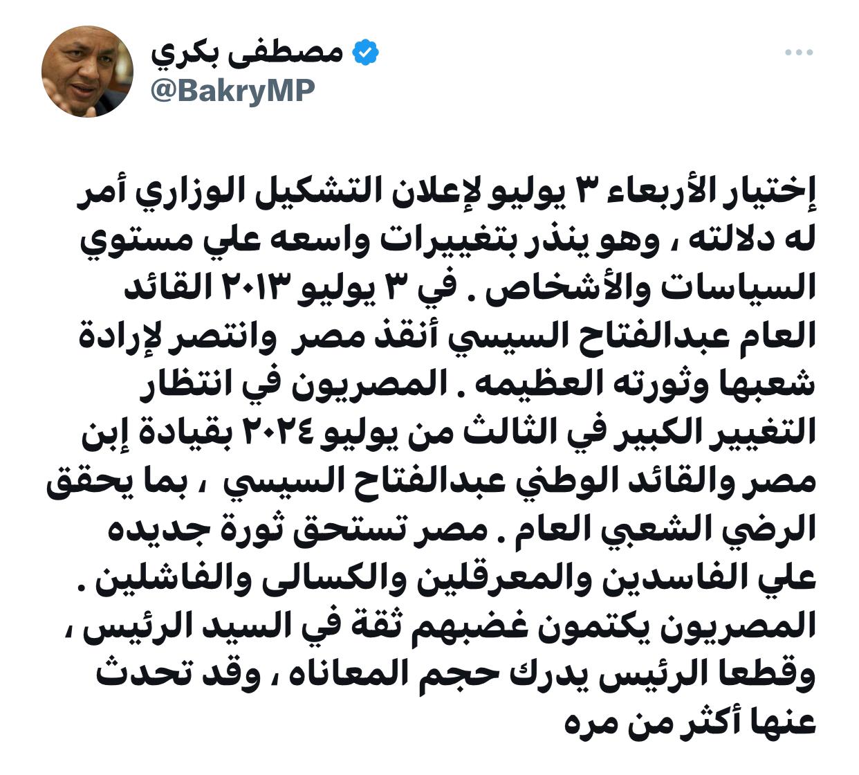 وأضاف بكري، عبر صفحته بمنصة إكس: «هذا الكلام على لسان مصدر مسؤول والمعلومات تشير إما الإثنين أو الأربعاء القادمين».