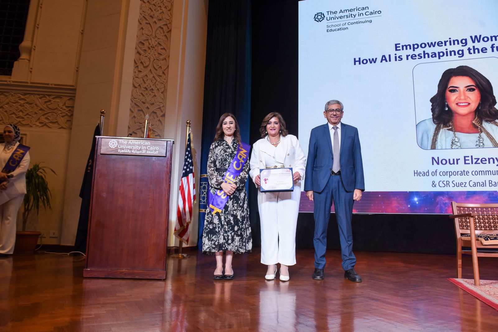 وقام د/محمود علام – عميد كليه التعليم المستمر بالجامعة الأمريكية بالقاهرة ، د/ دعاء سالم – رئيس اول وحده الاتصال و الشراكات لكليه التعليم المستمر بالجامعة الأمريكية بالقاهرة و مؤسس مبادرة “هي قادره” التي تدعم المراءة و مساهمتها في تنميه الاقتصاد المصري بتكريم بنك قناة السويس لدورة اثناء الفعاليات .